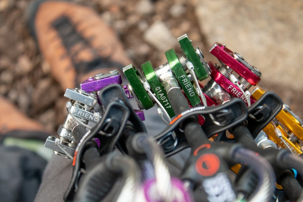 Most commonly, re-slinging your gear is reserved for cams. The metal parts of camalots will last–theoretically–forever. If they are well-maintained and there are no obvious deformations in the metal, cams can be used for a very, very long time.